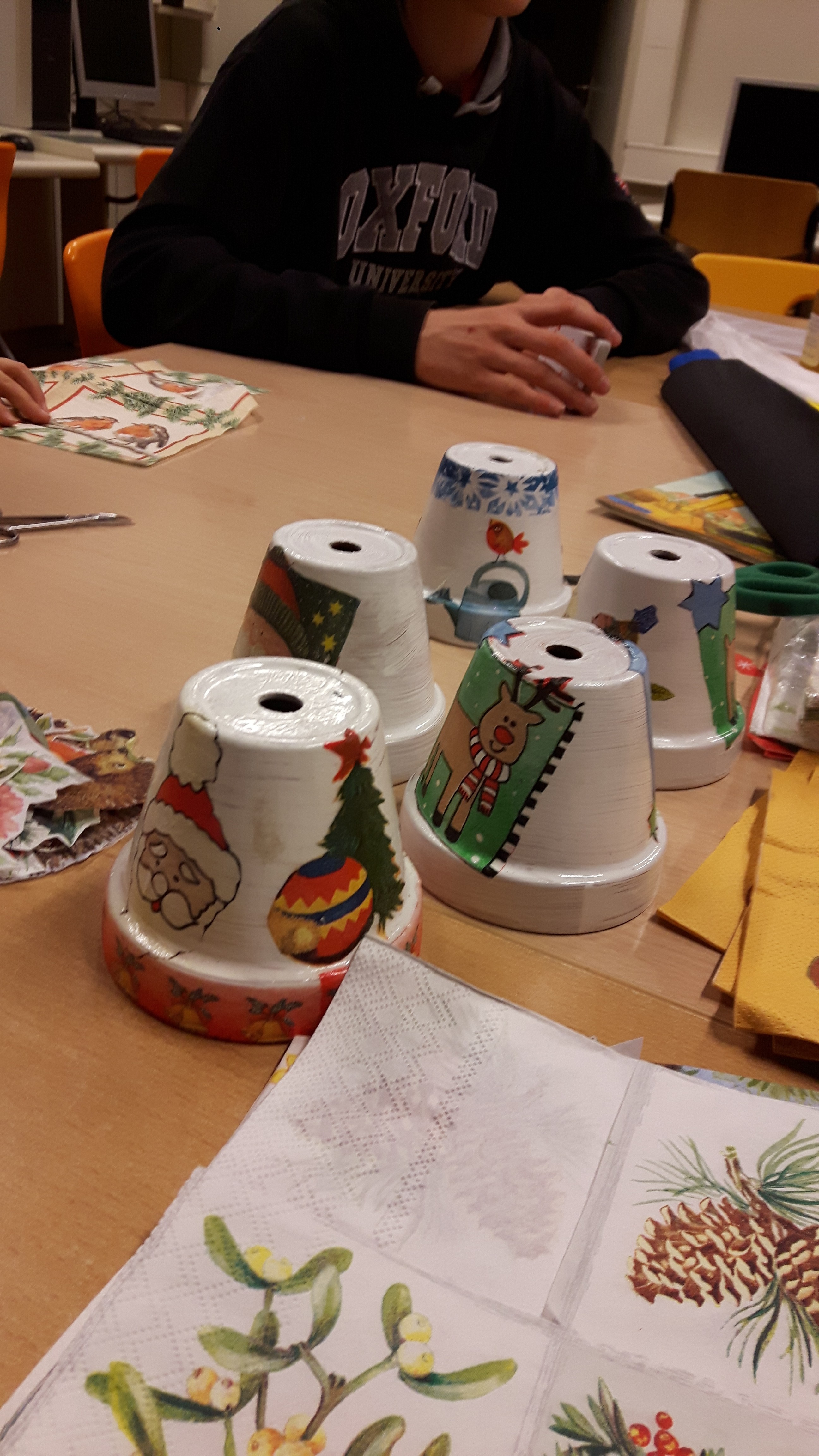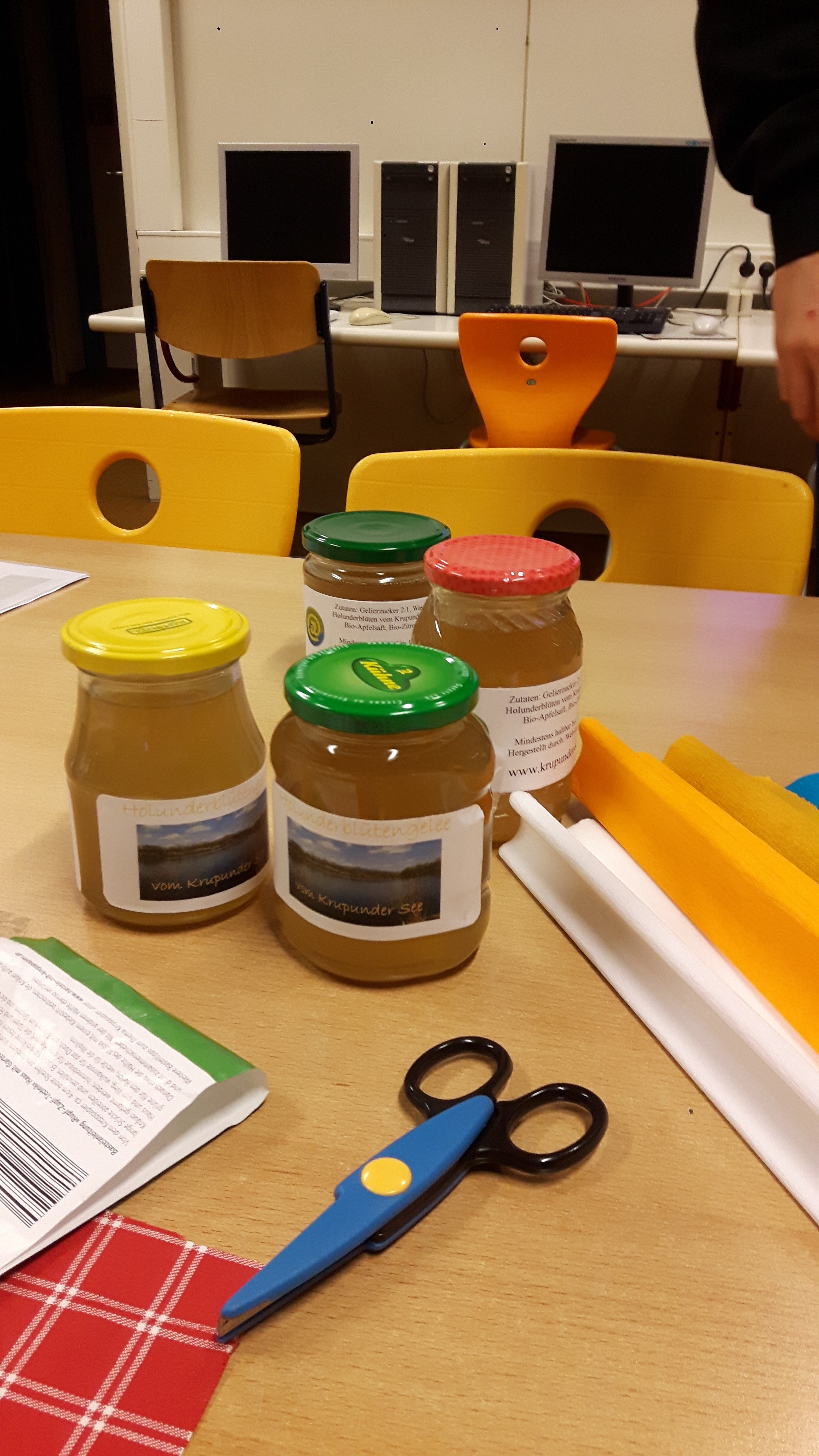Heute haben wir Sachen für den Verkauf auf dem Weihnachtsmarkt vorbereitet. Wir haben Motive aus Servietten ausgeschnitten, die wir beim nächsten mal auf Blumentöpfe kleben möchten. Außerdem haben wir Etiketten auf Holunderblütensirupflaschen und auf Marmeladengläser geklebt.