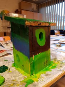 Ich habe einen Vogelkasten aus holz gebaut. Den Bausatz haben wir von der NAJU bekommen. Heute habe ich in angemalt. Die Seite von dem Vogelkasten habe ich : Grün, Blau und Gelb angemalt. Die Vorderseite, wo das Loch ist, ist Grün. Irgendwann in Frühjahr hengen wir meinen Kasten am Krupunder See auf. Dort könnt ihr ihn dann bewundern.
